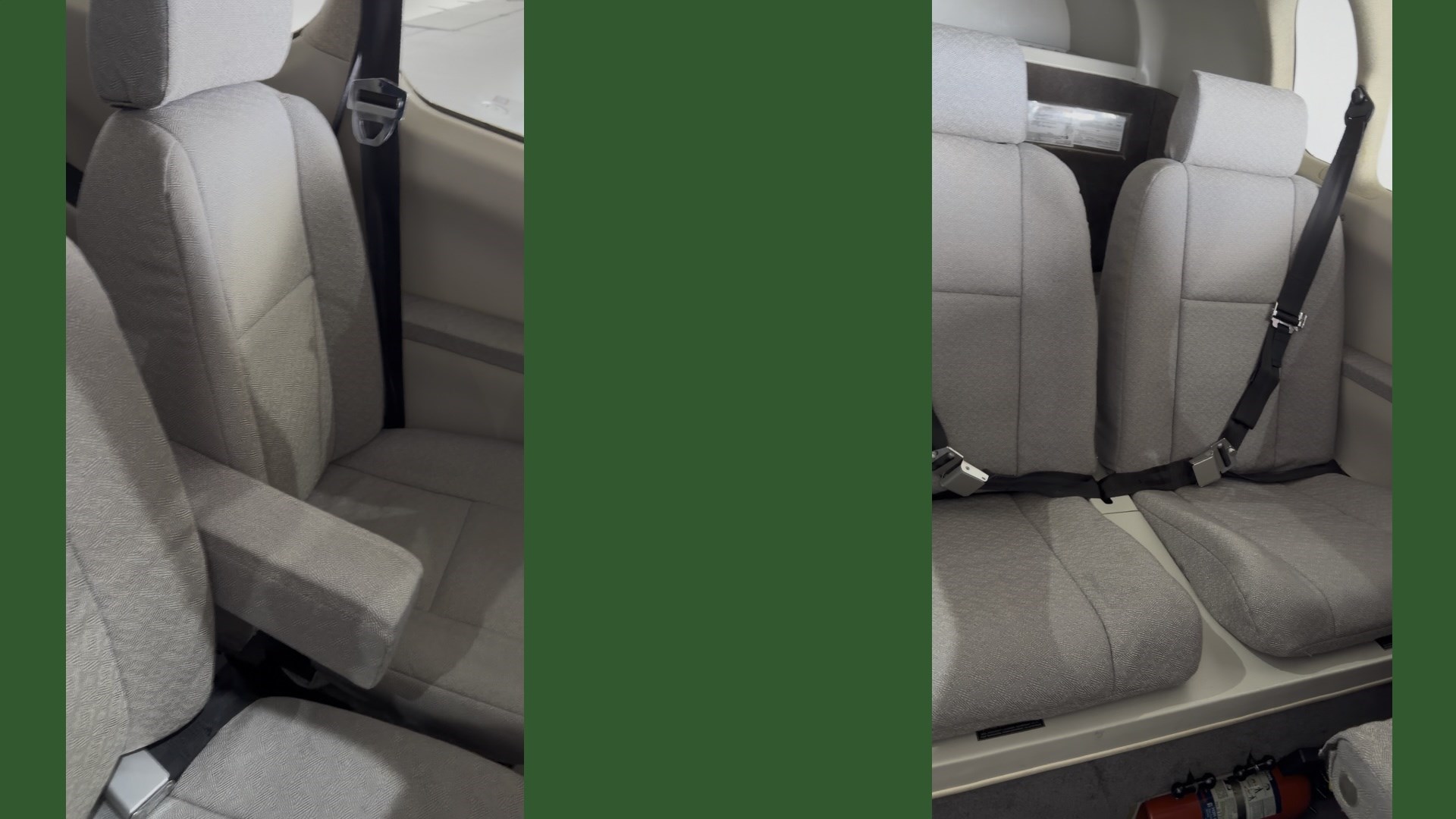 The cabin features a clean, contemporary aesthetic with light grey upholstery that offers a bright, airy feel and a sense of spaciousness. Complementing this is the elegant contrast of dark grey, durable carpeting, grounding the interior and adding a touch of sophistication while helping to minimize glare. Light sidewalls complete the look, reflecting ambient light to keep the cabin inviting and open.  |
